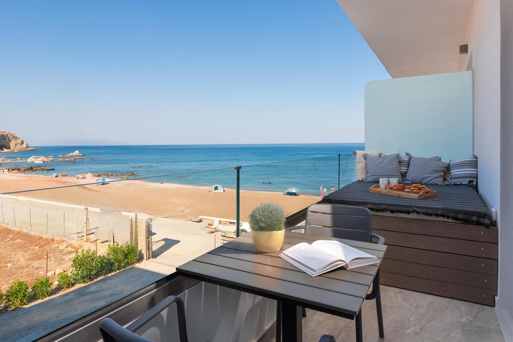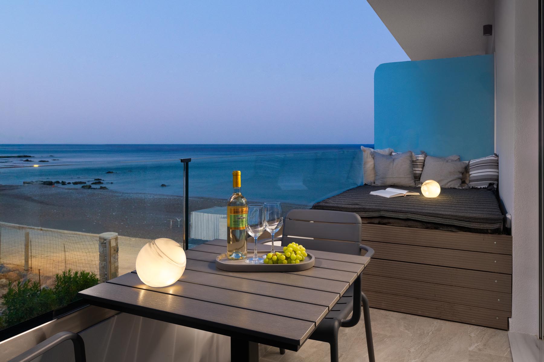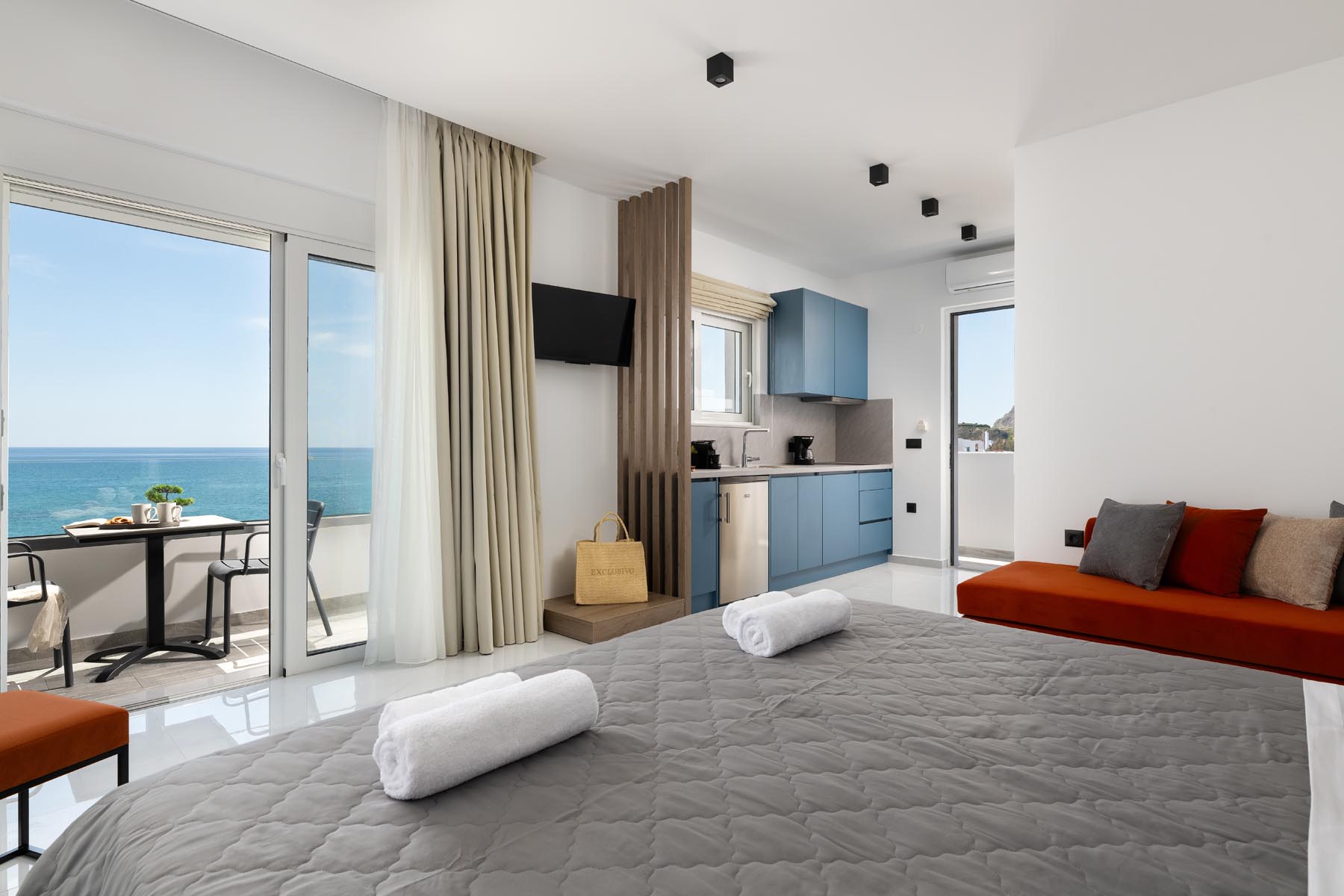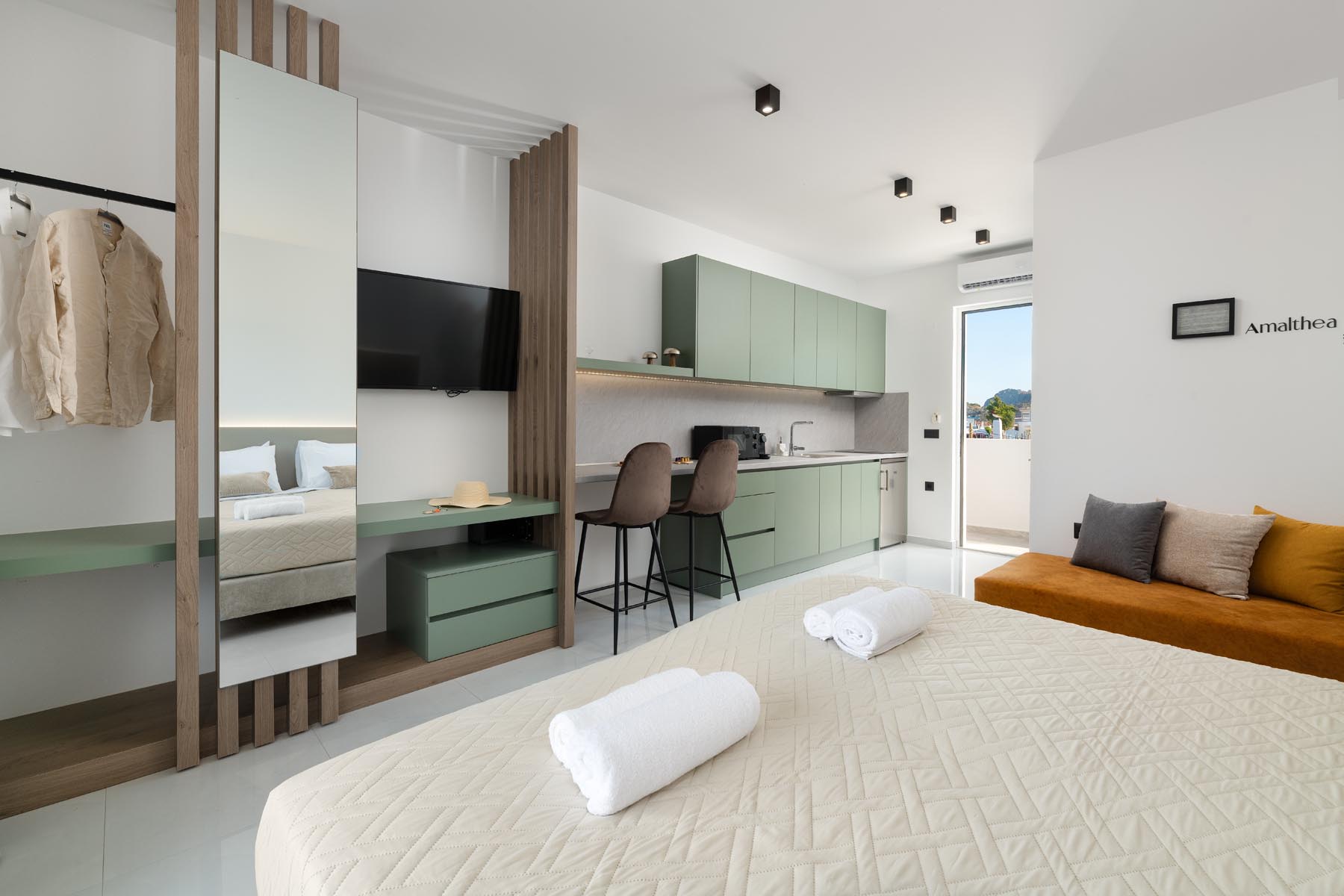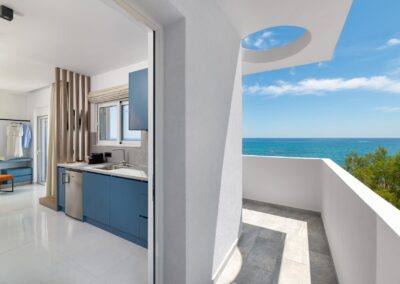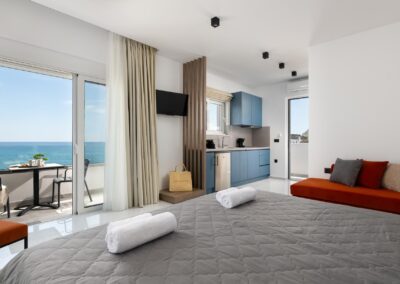 The Amalthea Suite offers a comfortable bedroom with a double bed or two single beds, a sofa bed, and a modern bathroom. A travel cot and a high chair are available so our little guests can fully enjoy their holidays. The fully equipped kitchen allows you to prepare your meals and dine at the indoor dining table. The built-in bench and table on the balcony create an ideal space for relaxation.