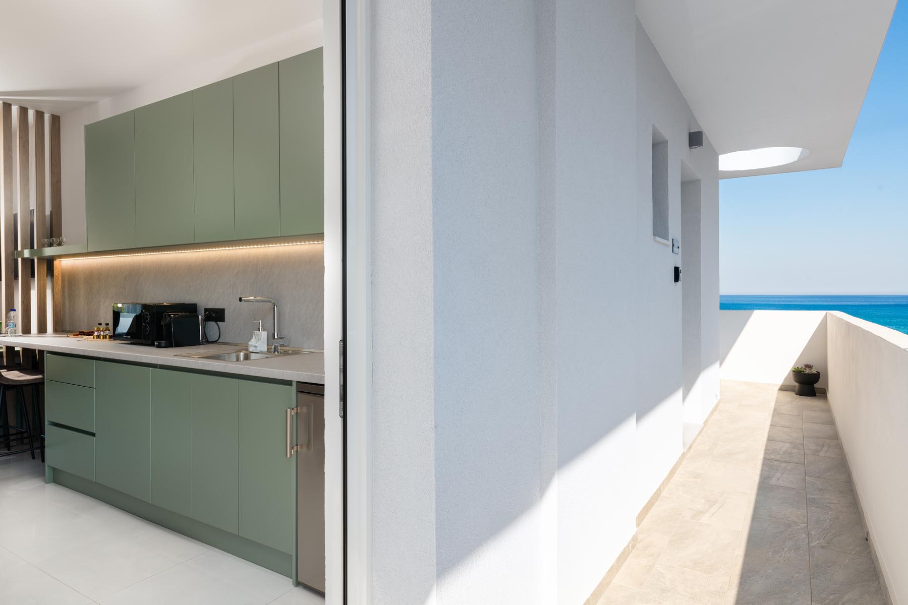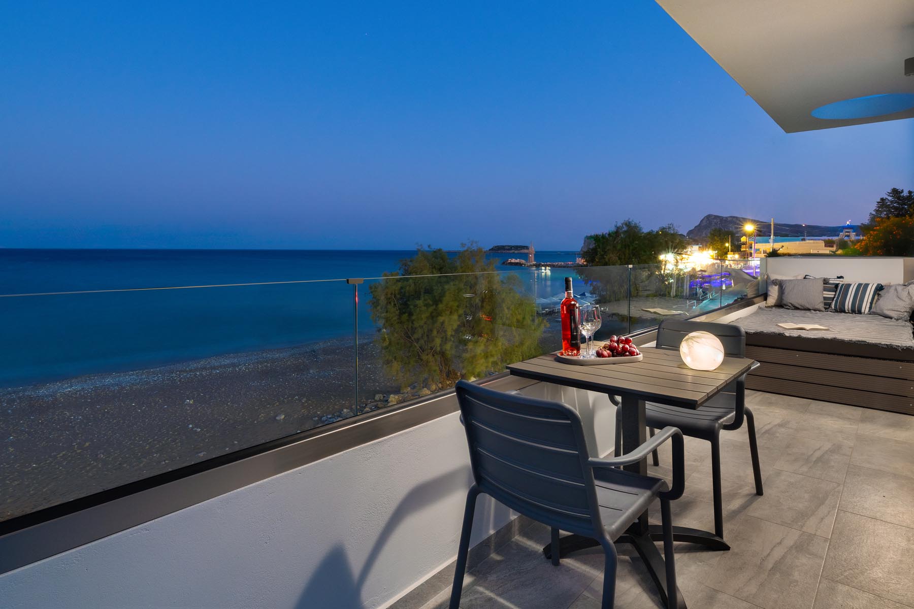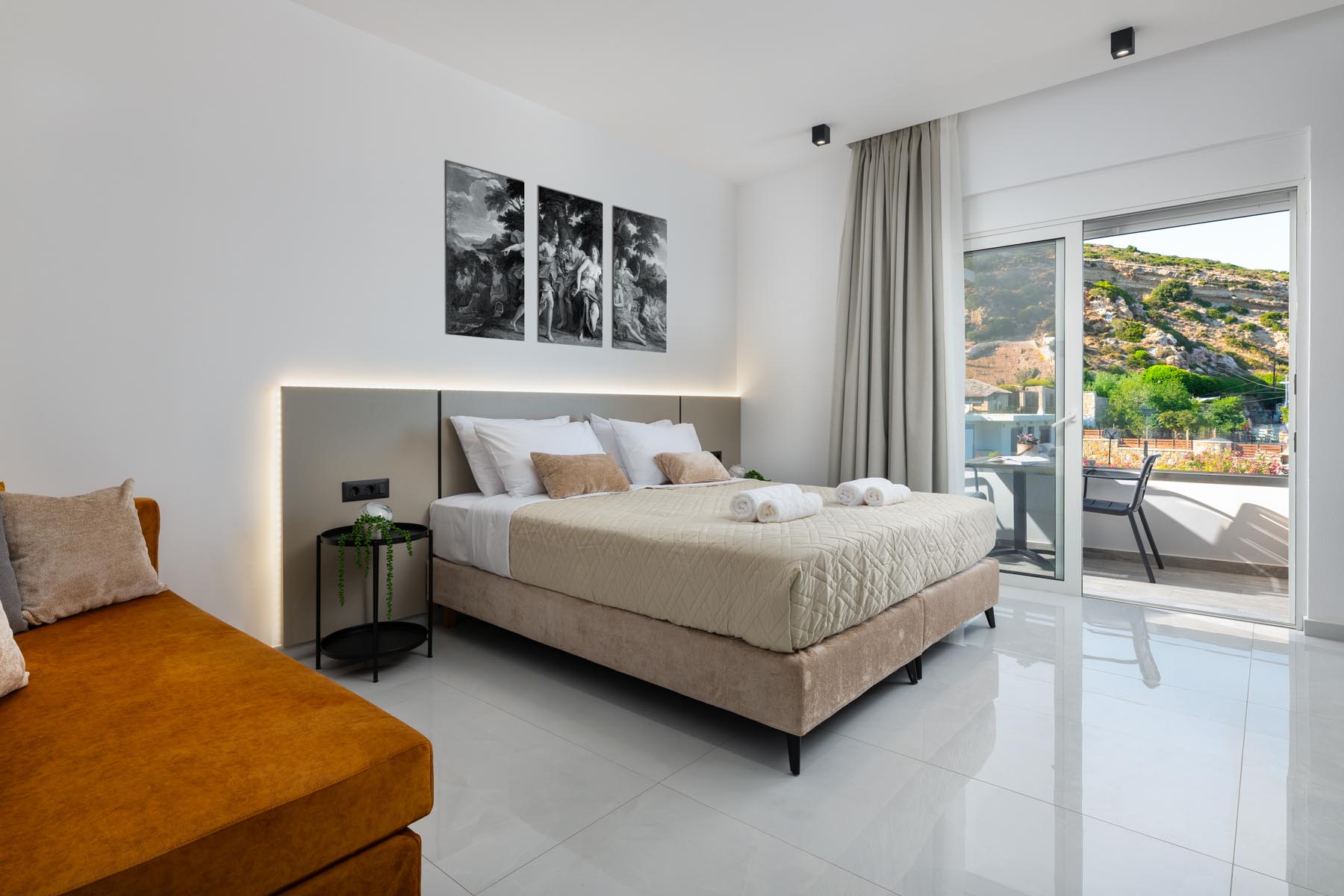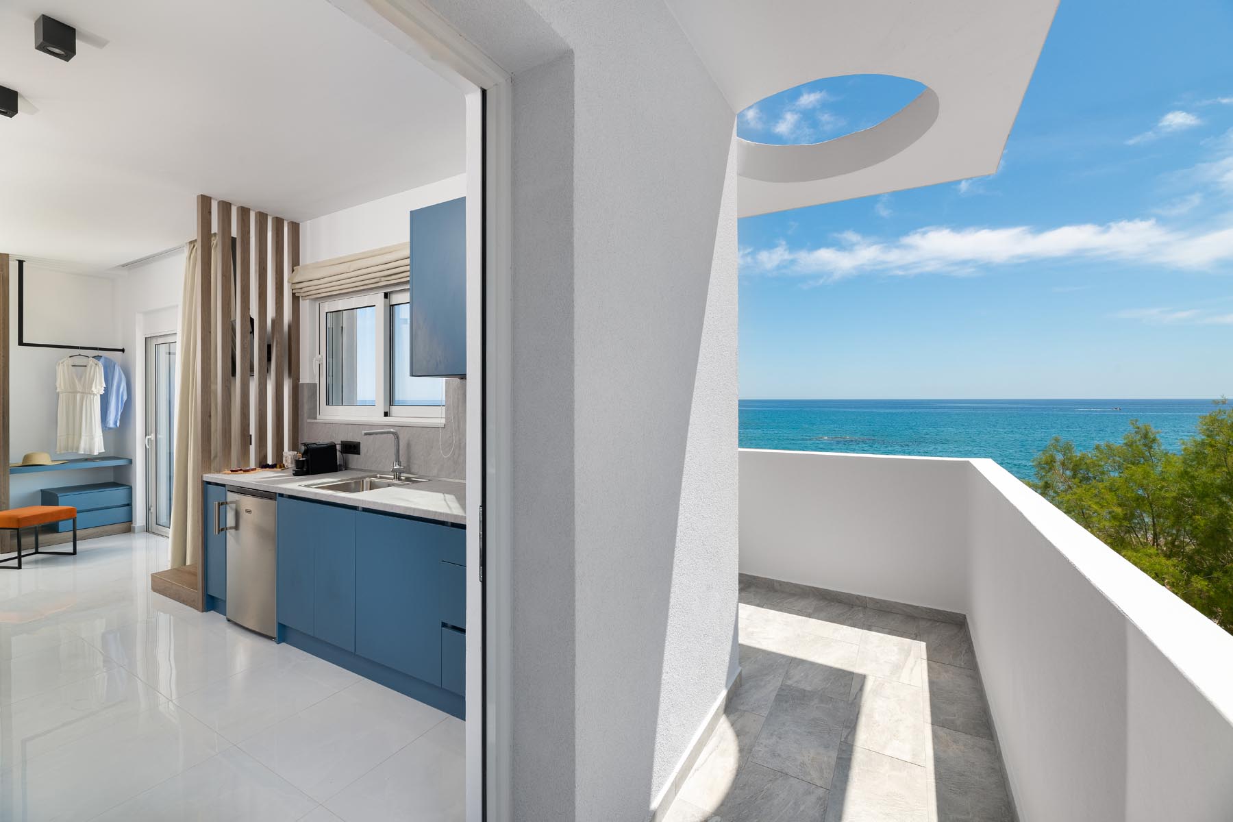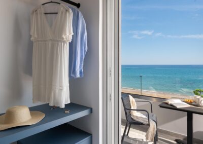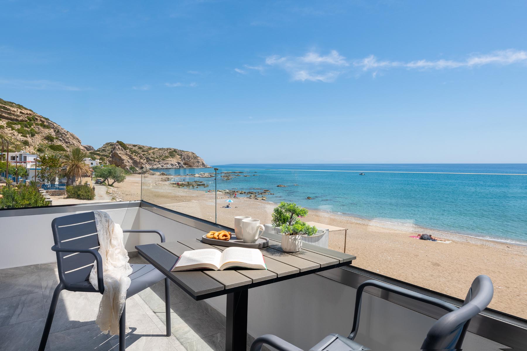 The Amalthea Suite offers a comfortable bedroom with a double bed or two single beds, a sofa bed, and a modern bathroom. A travel cot and a high chair are available so our little guests can fully enjoy their holidays. The fully equipped kitchen allows you to prepare your meals and dine at the indoor dining table. The built-in bench and table on the balcony create an ideal space for relaxation.