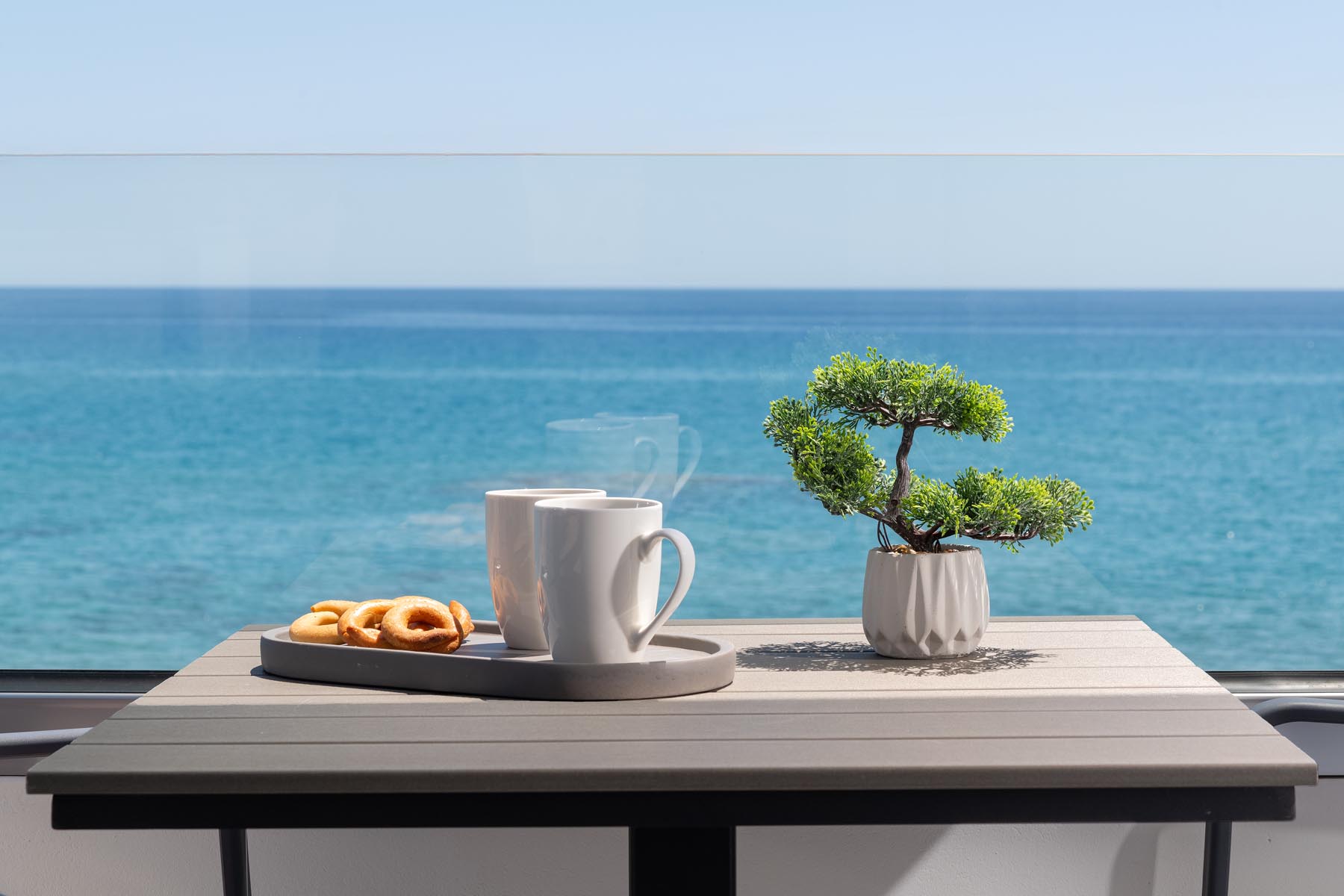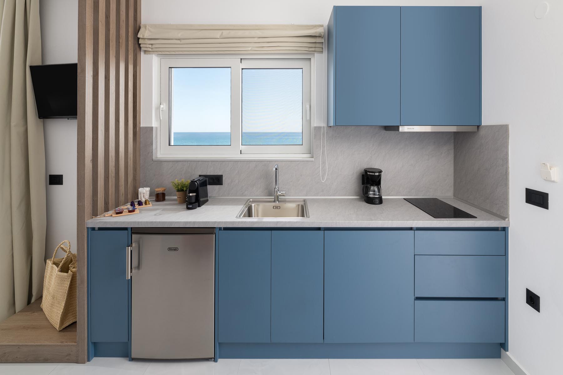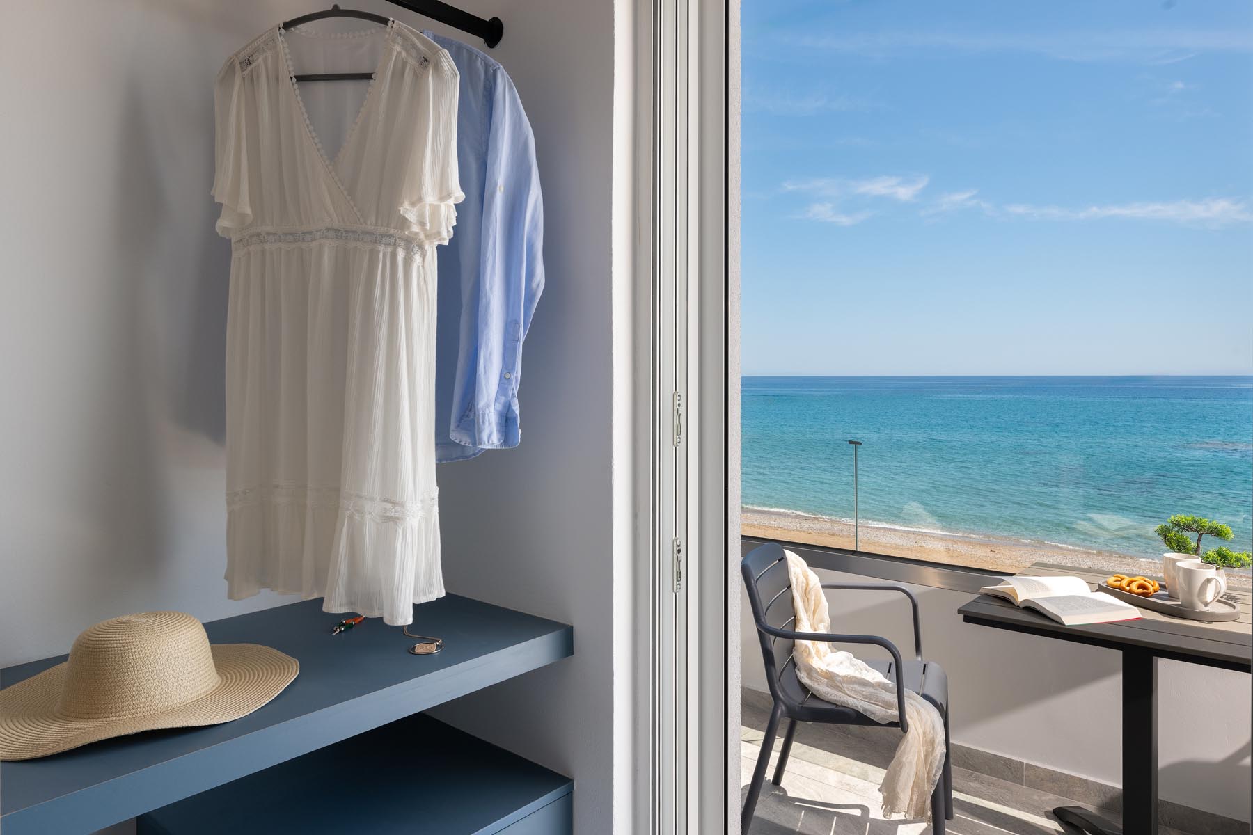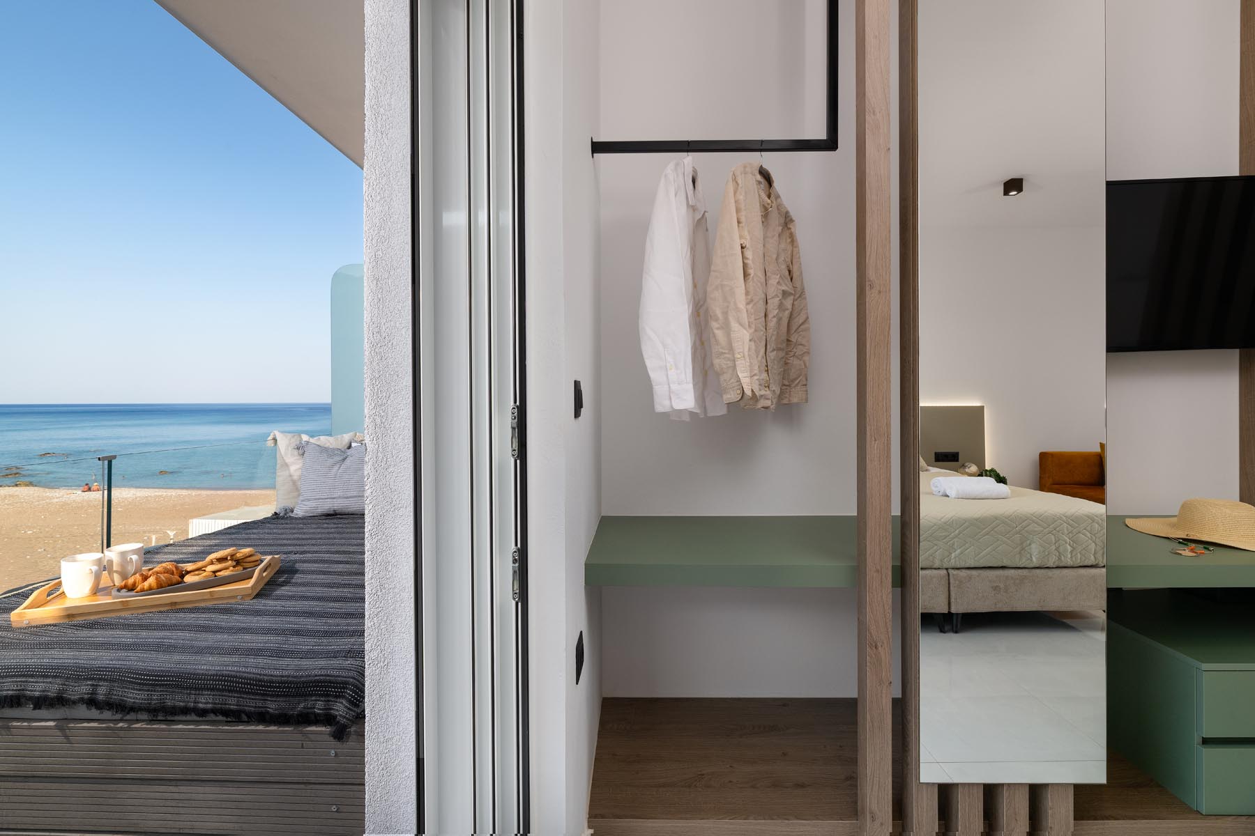 The Amalthea Suite offers a comfortable bedroom with a double bed or two single beds, a sofa bed, and a modern bathroom. A travel cot and a high chair are available so our little guests can fully enjoy their holidays. The fully equipped kitchen allows you to prepare your meals and dine at the indoor dining table. The built-in bench and table on the balcony create an ideal space for relaxation.