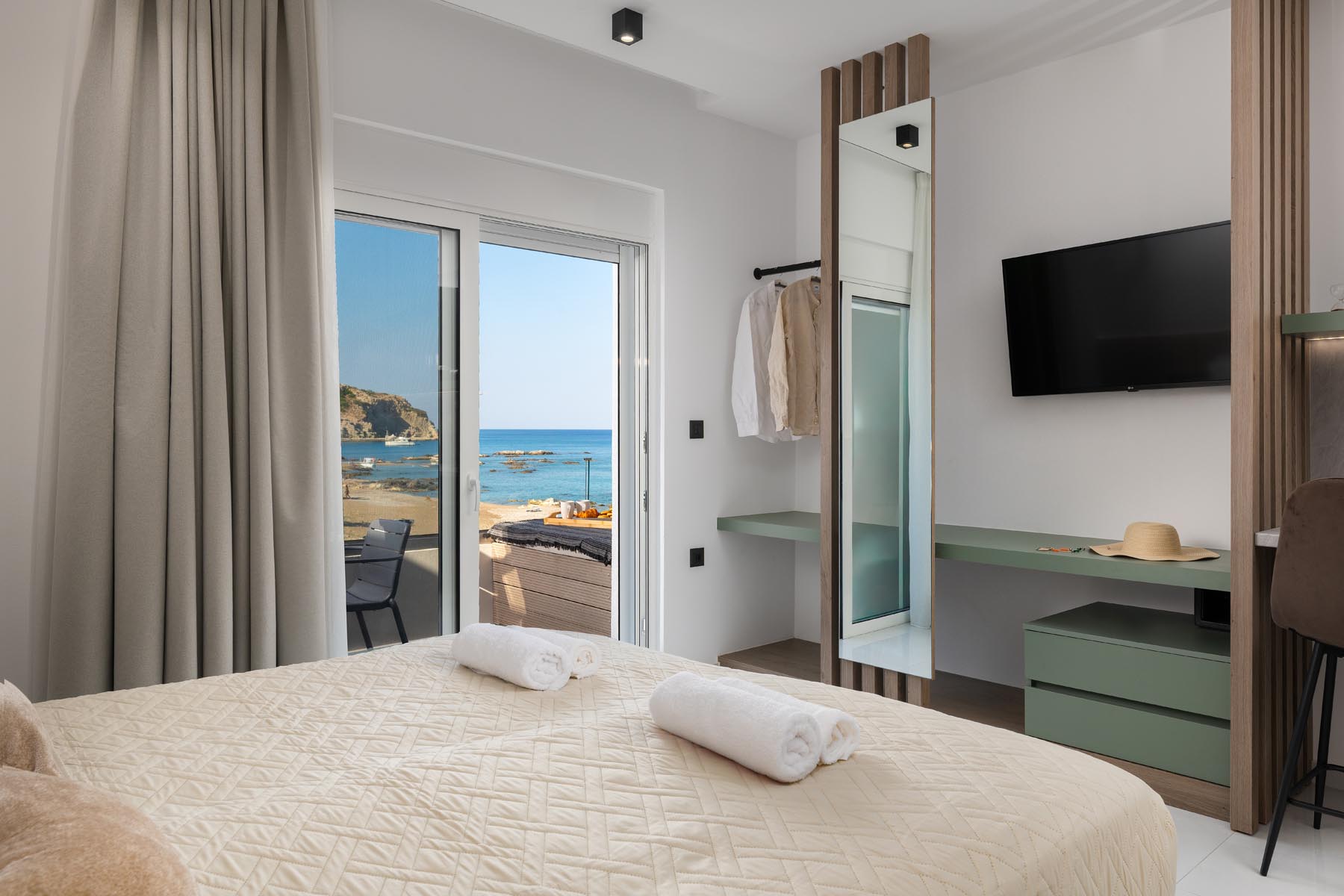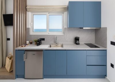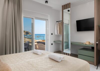 Outside, relax on your private sunbeds under a parasol, or explore the nearby beach just a short stroll away.The property also offers private parking, ensuring easy access and convenience. These suites are the ideal choice for couples or small families looking for a peaceful, self-catered getaway in Rhodes.