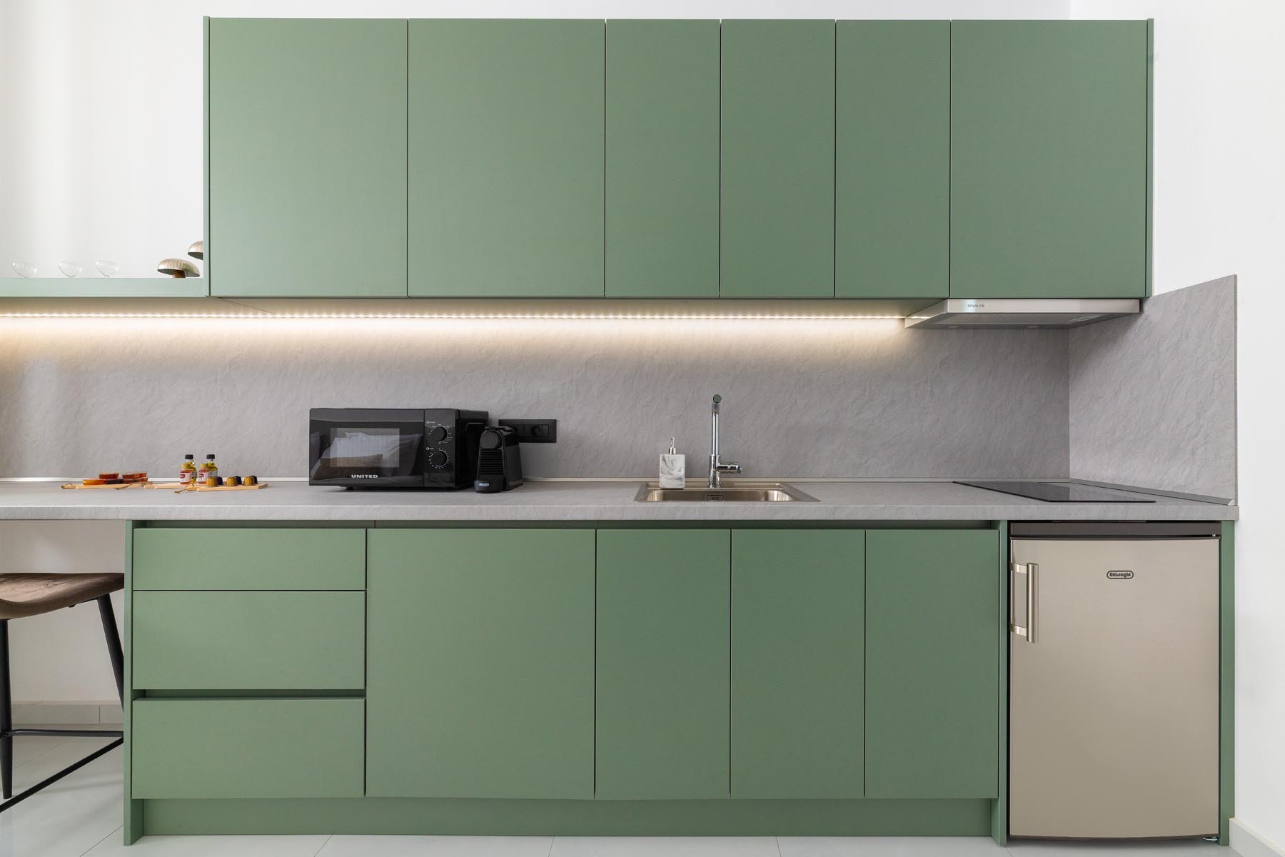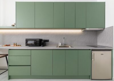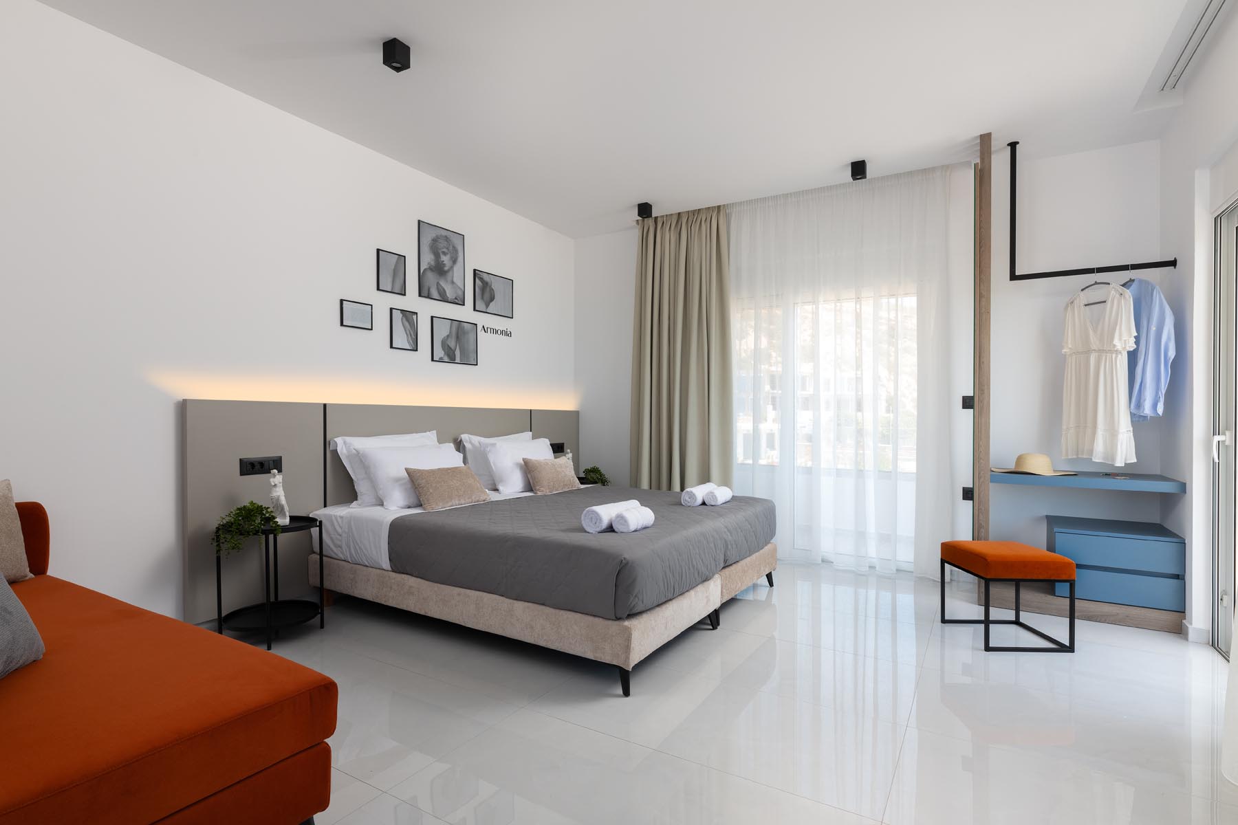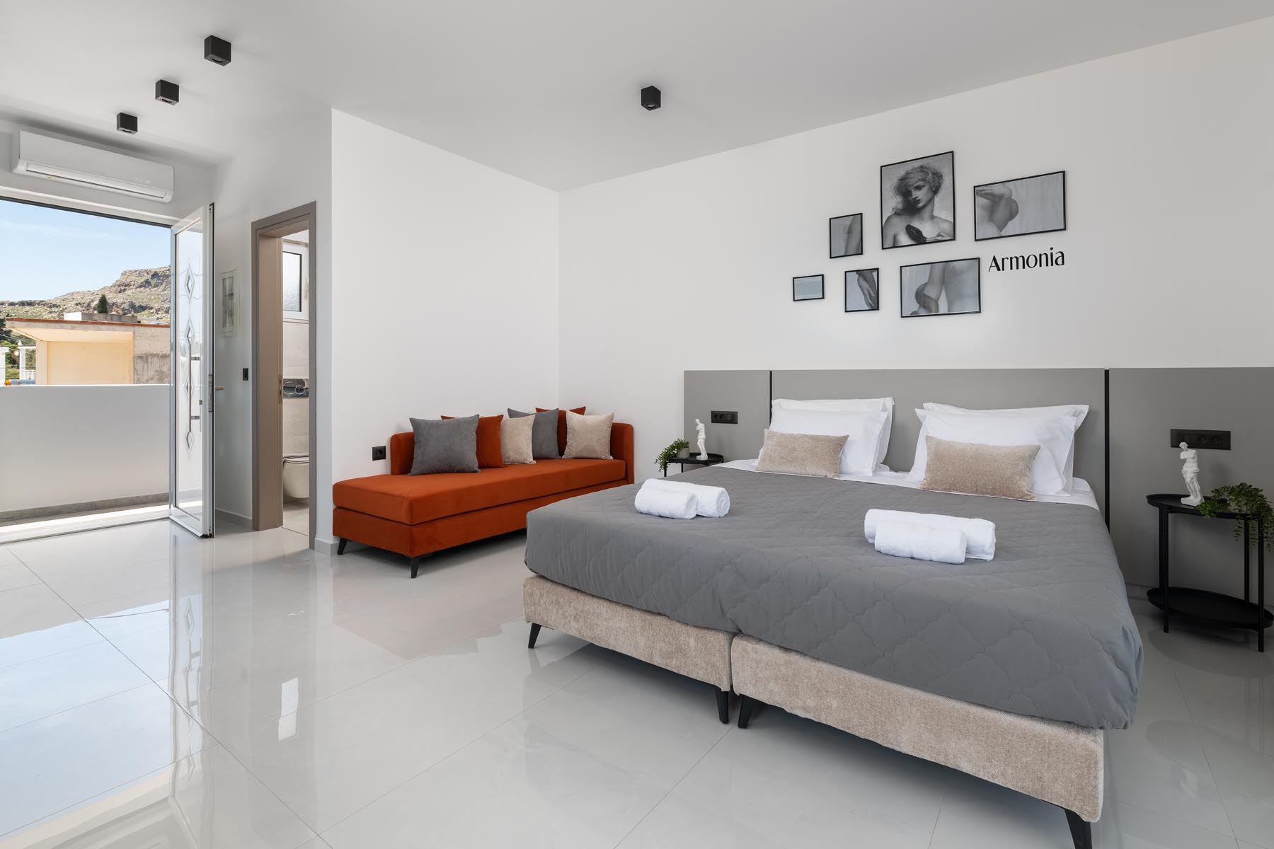 The Armonia Suite offers a comfortable bedroom with a double bed or two single beds, a sofa bed, and a modern bathroom. The fully equipped kitchen allows you to prepare your own meals, while the balcony’s table and built-in bench create a unique spot for relaxation.